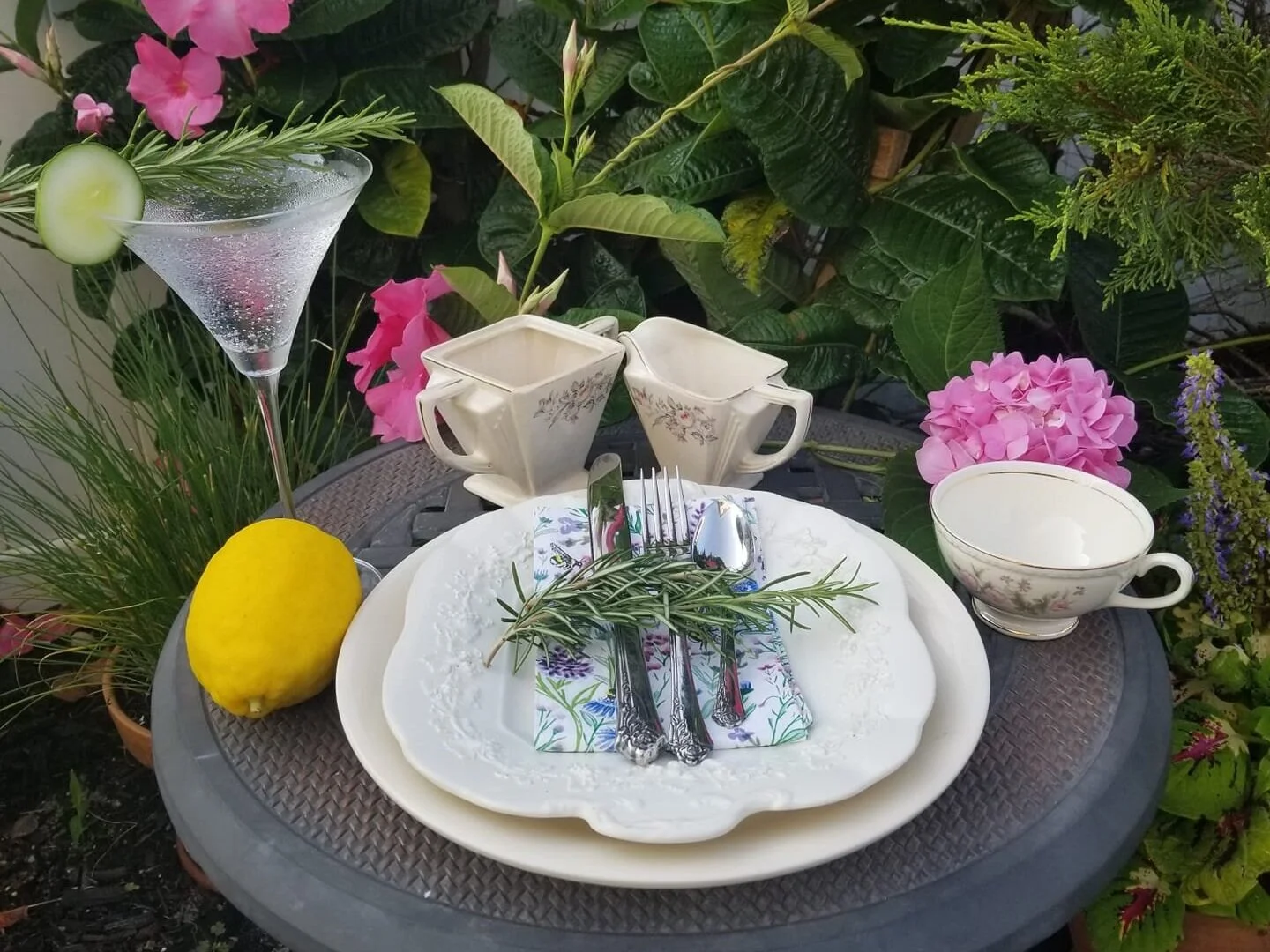 Anyway, back to this breakfast for today, and it’s time to set the table. If your group is small, use a small round bistro table. Maybe you could even try two small ones placed side by side. Now, if you have sufficient planters, try moving them in such a way as to create a path to your nook. And if your yard includes blooming shrubs, clip a few hydrangeas or magnolia blooms, or rescue a few fallen ones from the ground, and just float a few in a shallow bowl of water for a pretty centerpiece (or centerpieces). Consider tablecloths if your tables are less than pretty, and definitely use cloth napkins wrapped with the herbs you’ve been growing all summer or those from the market. Parsley, rosemary and mint work well, but use what you have. Be sure to cut long pieces and just wrap gently for a really pretty presentation. Finally, use the good dishes – china and glassware. It makes guests feel special.