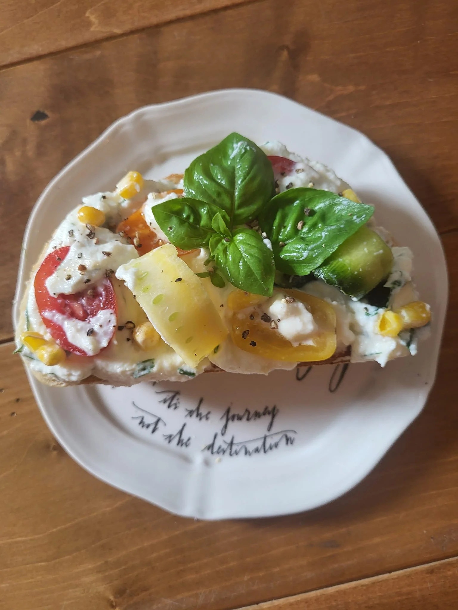 Preheat oven to 300 degrees. Brush slices of bread with olive oil and spread with desired amount of minced garlic. Place on a baking sheet. Bake for 7 minutes, then broil while watching to desired crispness. While bread is in the oven, mix ricotta, chives, dill, parsley in a small bowl and set aside. Add cherry tomatoes, pepper, salt honey, vinegar, and shallot to a small bowl. Toss to combine and set aside. Use a peeler or mandoline and thinly slice zucchini and squash into ribbons. Slice kernels of corn off the cob. When toast is removed from oven, spread with ricotta. Top with zucchini/squash, corn, tomato salad, and extra herbs, salt, and pepper.