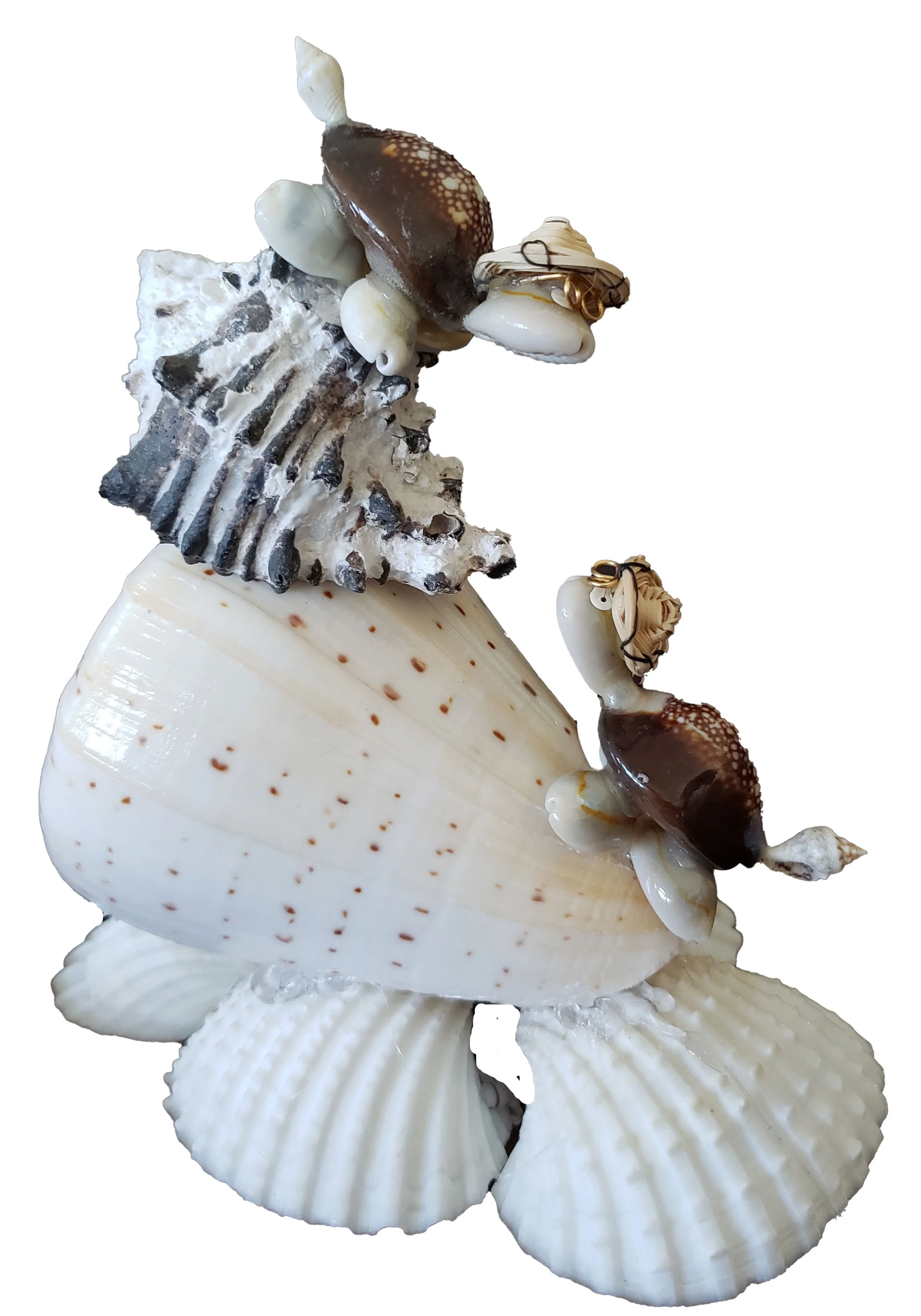 But, I’m really on assignment to talk with Lou about what’s now making him a local celebrity: turtles, whimsical figurines, that with the aid of a glue gun he makes with shells, miniature straw hats and spectacles.