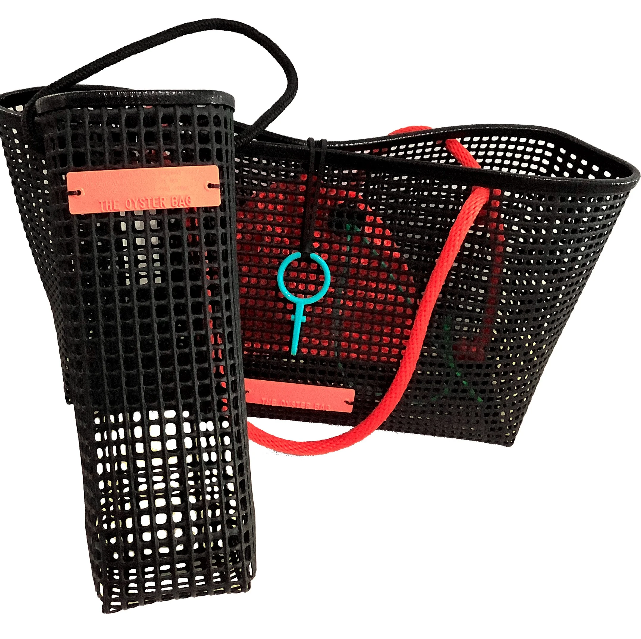 Designed with authentic aquaculture farming equipment, the beach bag and wine carrier are as rugged as the oysters that grow in them. This is the epitome of beach essentials!