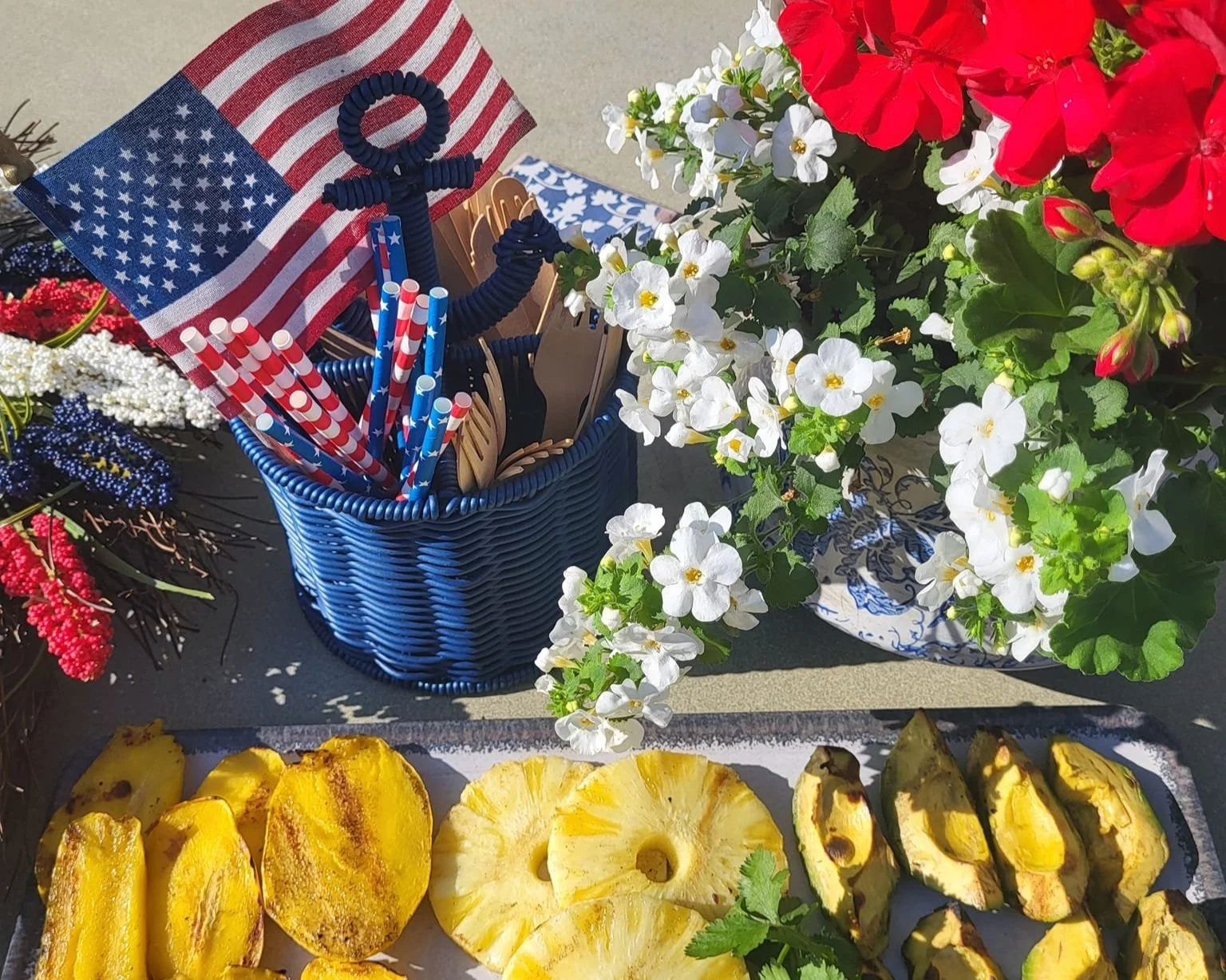 Now, just because we will offer some nontraditional menu items doesn’t mean we will forgo the traditional theme for a summer holiday weekend. Staying with the red, white, and blue feels right. If you are like me, you’ve gathered a nice collection of patriotic-themed serving pieces, and this time of year, the selection to add to your collection is abundant. A blue or red checked tablecloth or star-themed napkins set a familiar picnic tone; even lighter shades of blue combined with white and red can be festive. If all else fails, there are always flags and flowers. Surely you can count on finding some red geraniums or white and blueish pansies. One easy way to display the patriotic theme is with a few pots of red, white, and blue flowers, or any combination of these. Adorn the pots with some small ornamental American flags, and you have instant décor.
