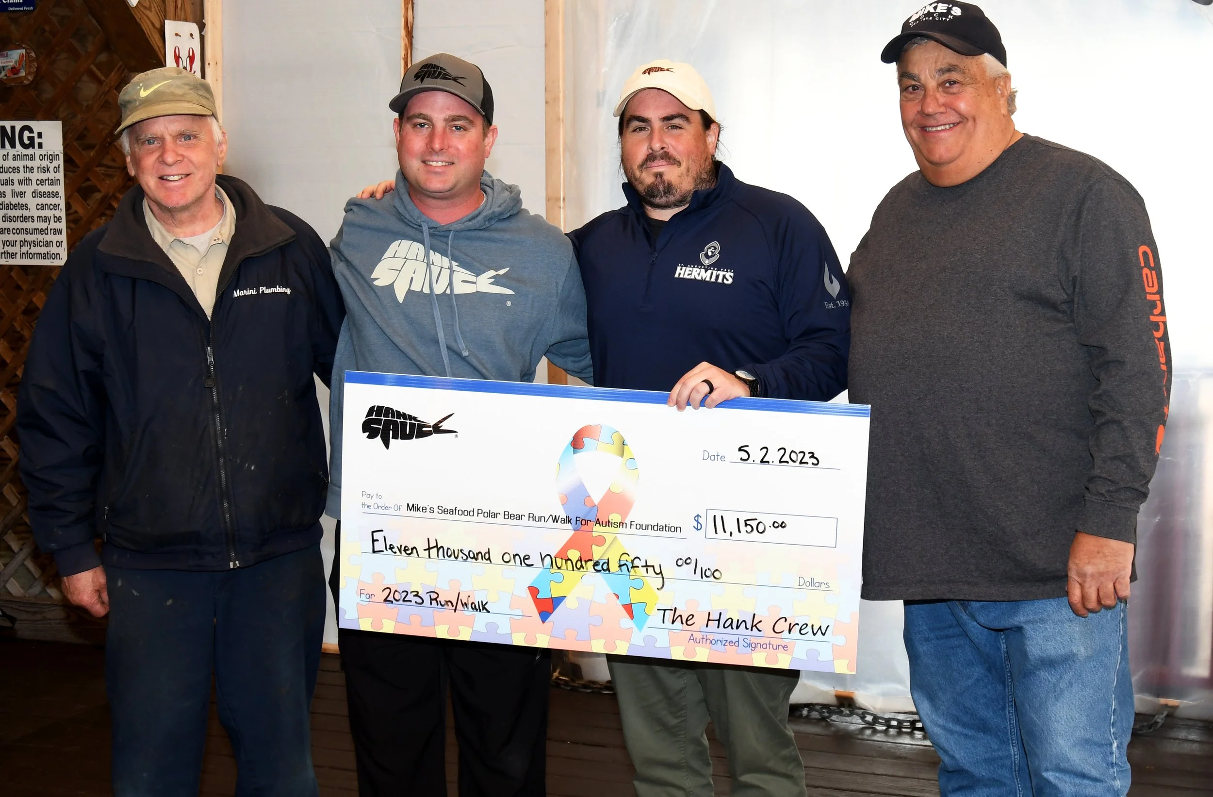 Brian Ruxton and Matt Pittaluga of Hank Sauce (center) presented Mike Givens and Mike Monichetti with a generous donation for the Mike’s Seafood Run/Walk for Autism.